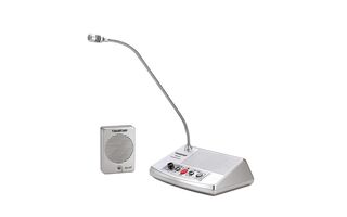 Переговорное устройство типа "кассир-клиент". Микрофон на гибкой шее с громкоговорителем на основном блоке и выносной блок с микрофоном и громкоговорителем (клиентская часть), сетевой адаптер питания.